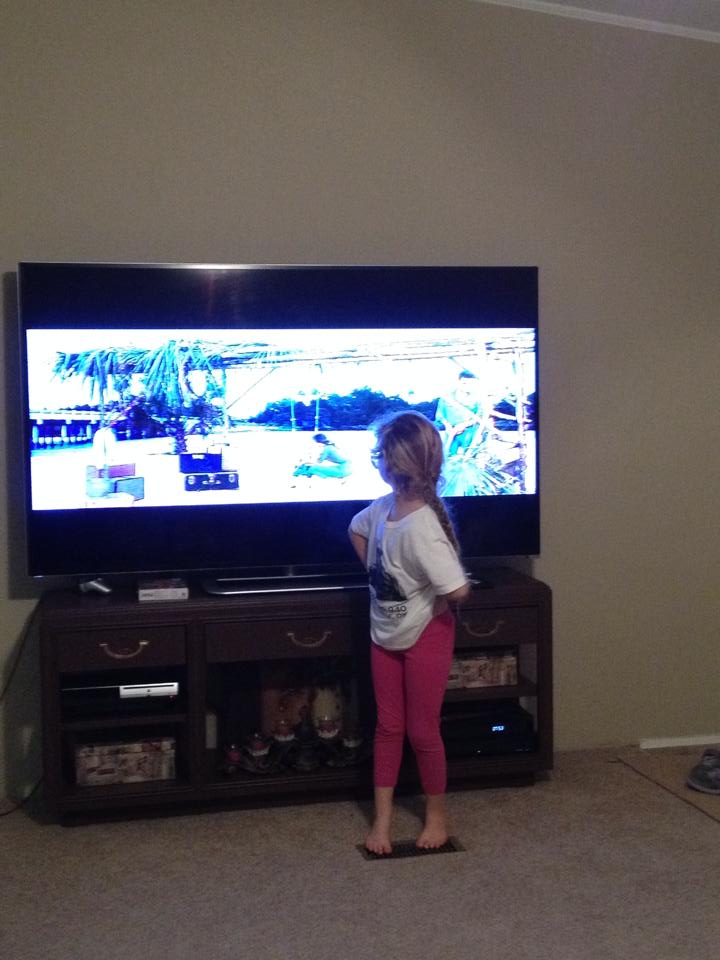 His sister, my great-niece Reagan, is five years old, and she is a true blue Elvis fan. It’s so adorable how much she loves him. Recently, her mother introduced her to his movies and they had a mini-marathon. I’m anxious to hear how that turned out. (they live out of town and we don’t see one another as often as I would like) Here is a pic of her in front of the television while Follow That Dream played.