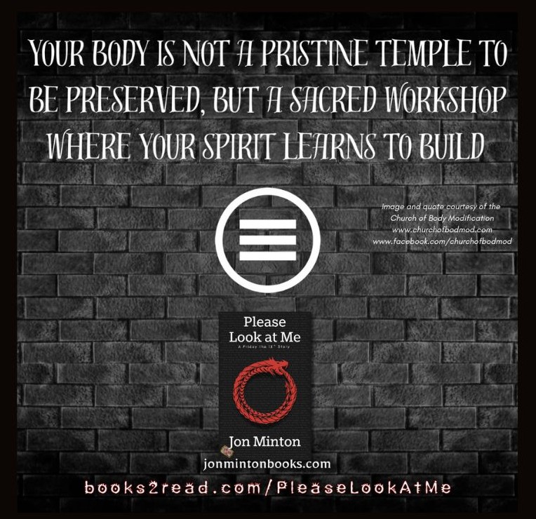 The characters in Please Look At Me discuss creating a church to establish Autophagia as a religious practice to protect themselves from people who are trying to ban it. This was inspired by the Church of Body Modification, which was founded in 1999 by Steve Haworth, an influential body modification artist. It grew quickly because of support from several other influential voices in the body modification community, such as Shannon Larratt, Philip Barbosa, Beki Buelow, and Shawn Porter, and currently lists members from 24 different countries.